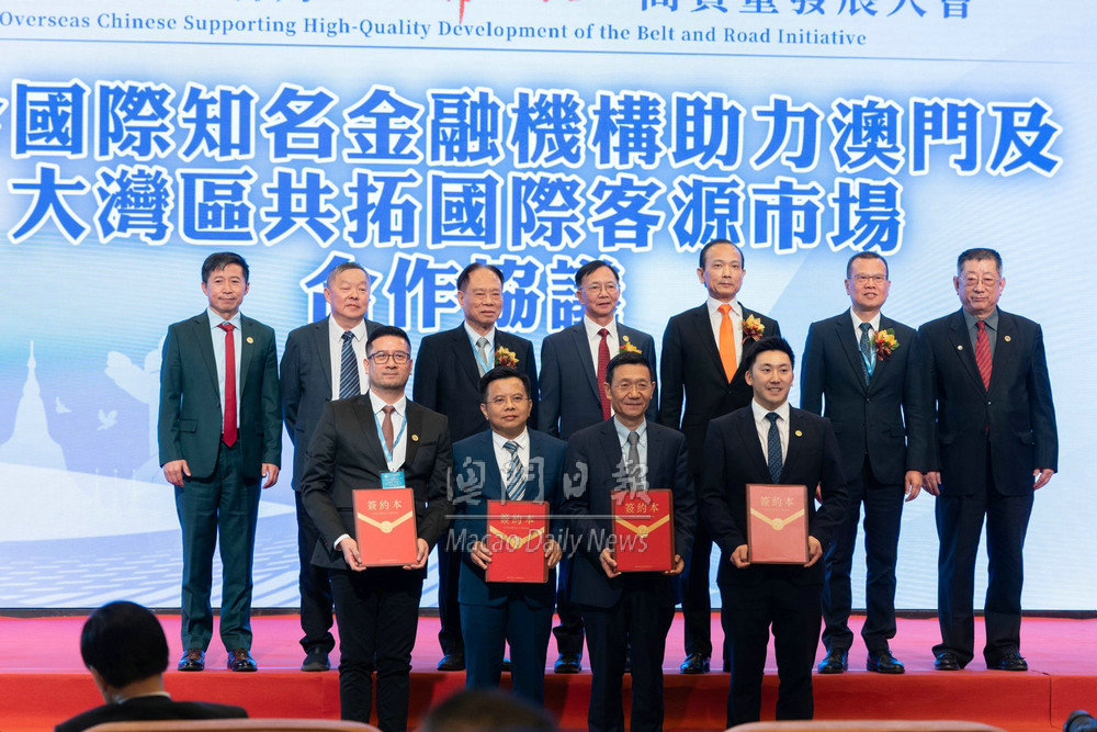 會上舉行《聯(lián)合國際知名金融機構(gòu)助力澳門及大灣區(qū)共拓國際客源市場合作協(xié)議》簽署儀式,劉雅煌、黃景城、大灣區(qū)金融發(fā)展協(xié)會榮譽顧問陳冠勤、劉紅路、南方科技大學金融系主任王樹勳見證下,由澳航董事會主席陳洪、中國太平保險(澳門)副總經(jīng)理陳日湘、英國勞合社授權(quán)機構(gòu)IPH環(huán)球保險營運總監(jiān)黃子龍、大灣區(qū)金融發(fā)展協(xié)會理事長陸仁山共同簽署。